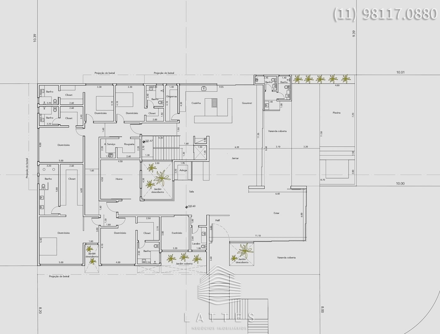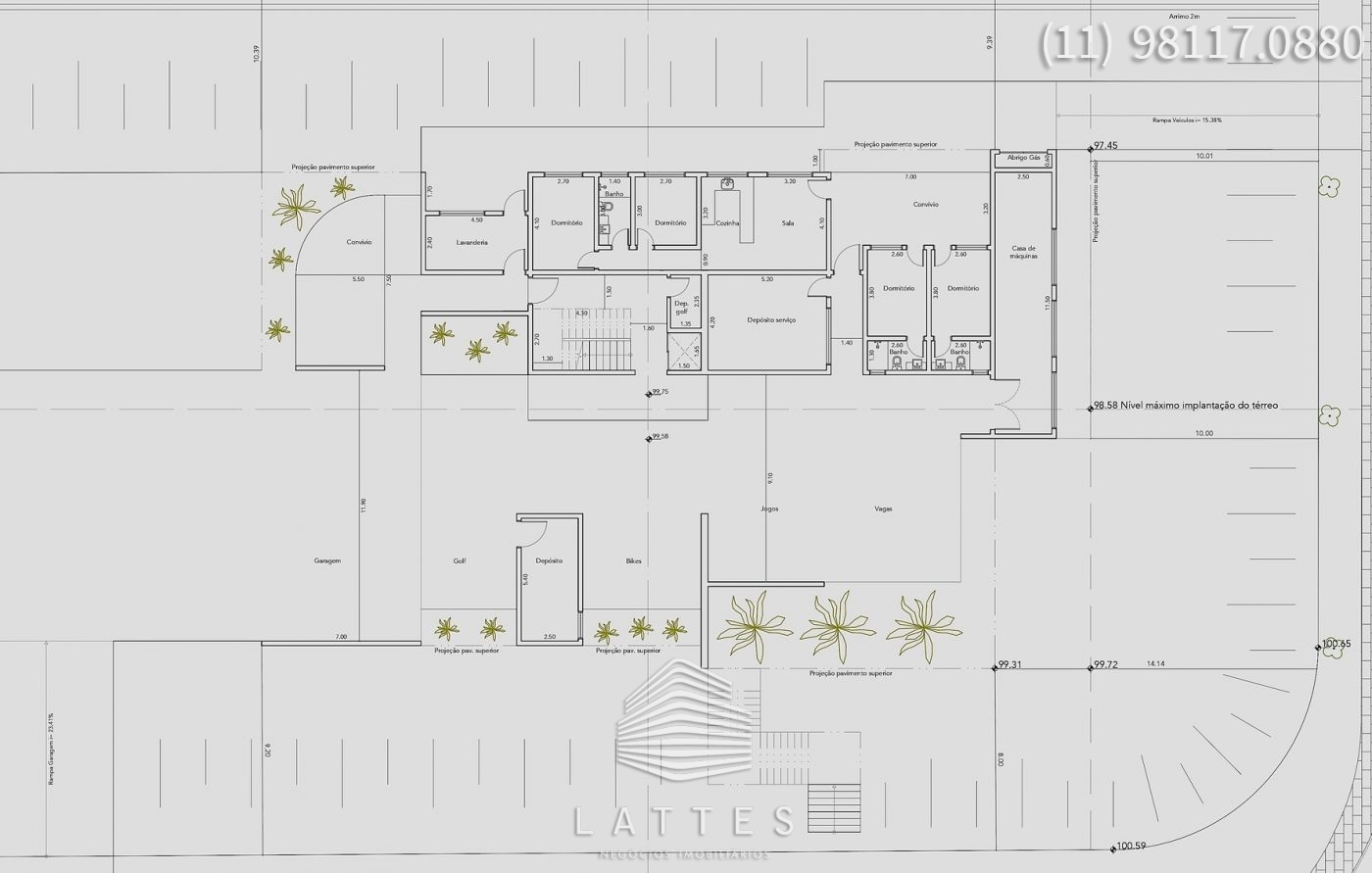 Arquiteta Nivia Tizeu - Área Terreno: 3.011,25 m² - Pavimento Social: 5 Suítes com closet, Rouparia - Hall de Entrada - Sala de estar, Jantar, Cozinha aberta, integradas à Varanda com área Gourmet - Jardim de inverno, Escritório e Home theater - Lavabo - Piscina com SPA, Vestiário Duplo - Pavimento Inferior: Área Multi-uso (Escritório, Jogos, Atelier, Ginástica) - Depósito de Golfe - Garagem coberta para autos e Carrinho de Golfe - Casa para funcionários com 2 Dormitórios, Banheiro, Sala e Cozinha, junto à área de convívio - Outras 2 Suítes externas para funcionários - Depósito de Serviço e Área Tecnica